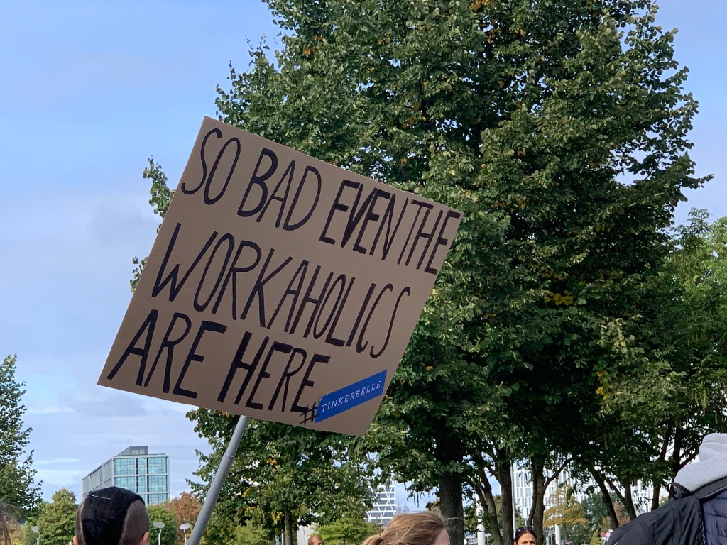 Esta pancarta vista en la marcha de Berlín, resume muy bien la situación actual: «la cosa está tan complicada, que hasta los adictos al trabajo estamos aquí.»